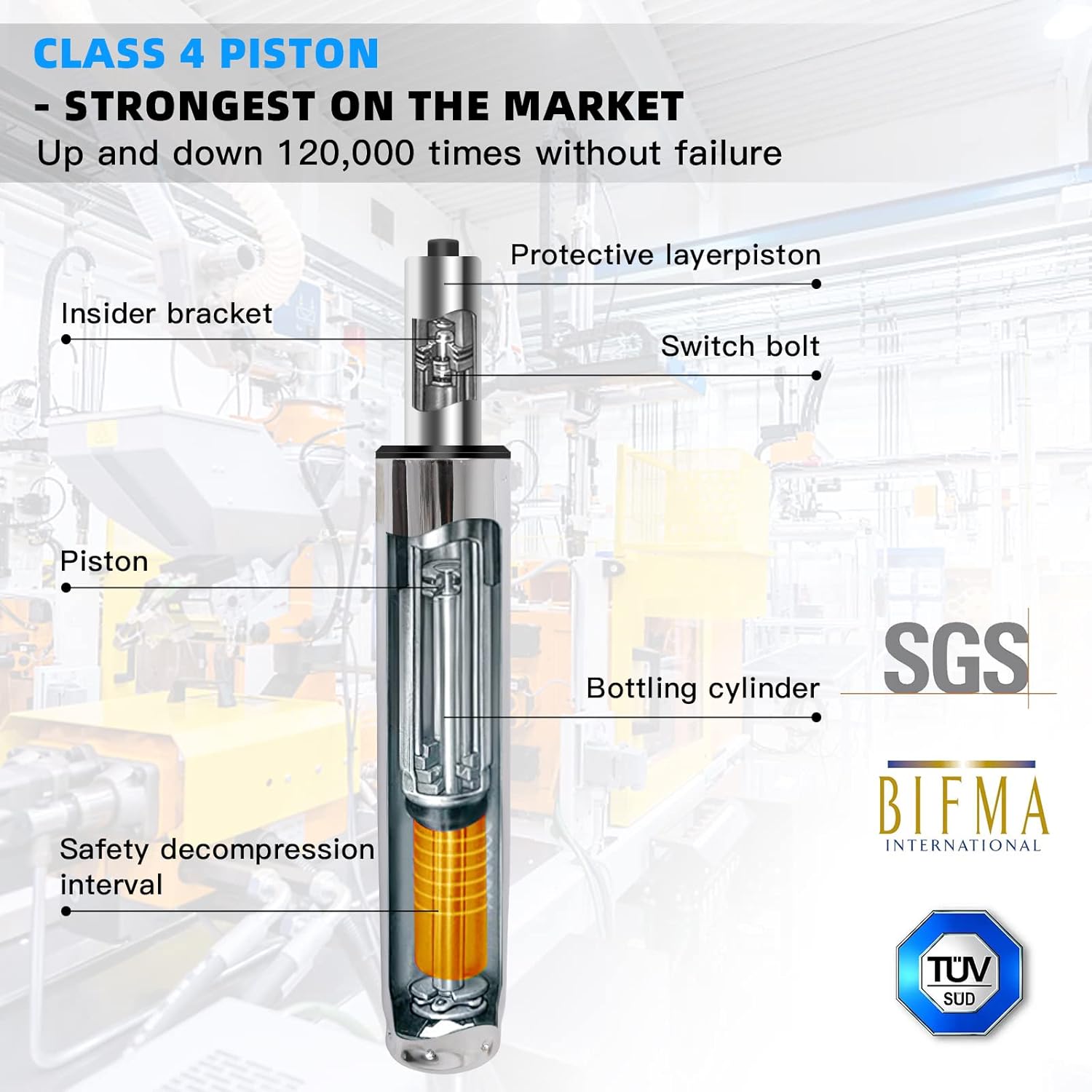 شهادة رسمية: أسطوانة رفع بمكبس هوائي متينة وتتمتع بأفضل جودة، تتحمل الوزن والضغط العاليين، توفر أمان عالٍ ومقاومة للانفجار. اجتازت أسطوانة رفع الغاز اختبار اس جي اس الألماني الرسمي وشهادة من رابطة مصنعي الأثاث التجاري والمؤسسي (بيفما)، وهي مصنوعة من الخارج من صلب سميك عالي الجودة لضمان الامتثال لمعايير الجودة
