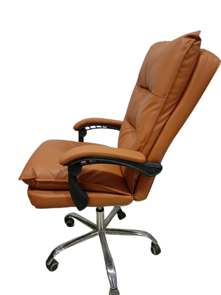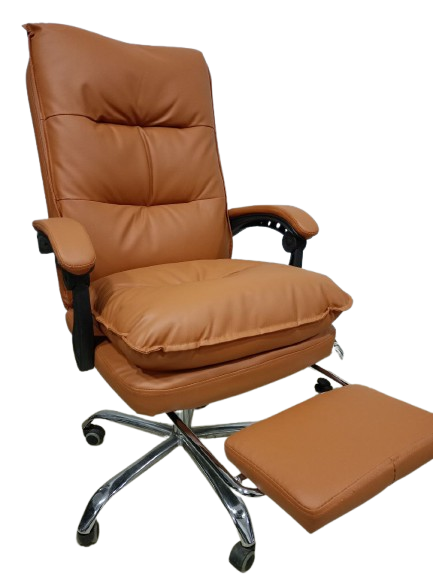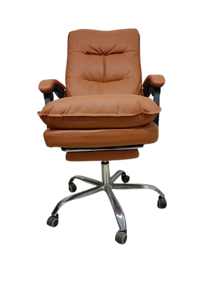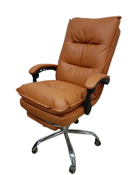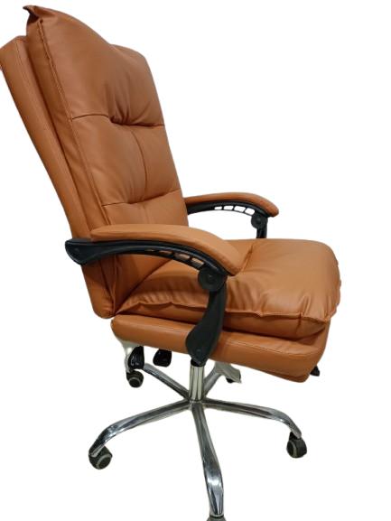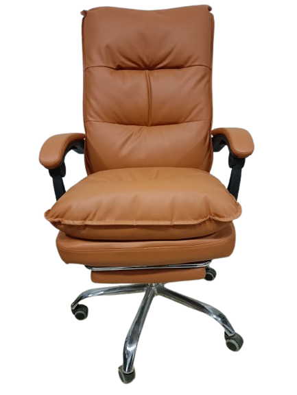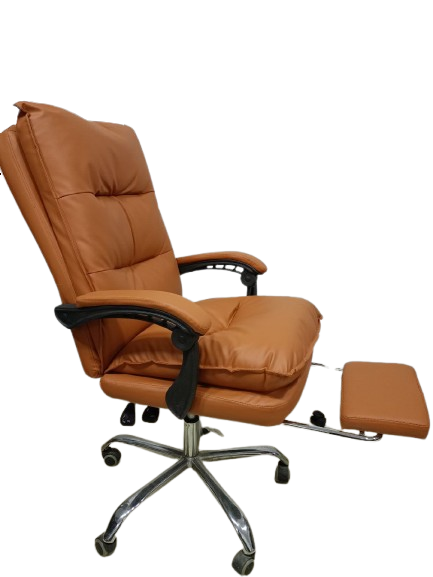 هذا كرسي مكتب ذو تصميم عصري وأنيق. يتميز ب: * المقعد والظهر: مبطنان بطبقة سميكة من الإسفنج لتوفير الراحة القصوى. * التنجيد: مصنوع من الجلد الصناعي عالي الجودة، مما يجعله سهل التنظيف ومتين. * مساند الذراعين: مبطنة ومريحة. * مسند القدمين: قابل للسحب، مما يوفر راحة إضافية أثناء الجلوس. * قاعدة الكرسي: مصنوعة من المعدن، مما يجعله قويًا ومتين. * العجلات: تتيح سهولة تحريك الكرسي. * اللون: برتقالي محروق، وهو لون عصري وأنيق. هذا الكرسي مثالي لمن يبحثون عن كرسي مكتب مريح وعصري. المميزات الإضافية: * قابل للتعديل ليناسب مختلف الأجسام. * مثالي للاستخدام في المكاتب والمنازل.