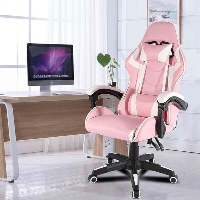 هذا الكرسي هو كرسي ألعاب مريح بلون وردي وأبيض. يتميز بتصميم عصري مع ظهر مرتفع مبطن ومسند رأس قابل للإزالة، بالإضافة إلى وسادة دعم للظهر. الكرسي مزود بمسندين للذراعين مبطنين لمزيد من الراحة، وقاعدة معدنية قوية بخمس عجلات لسهولة الحركة. كما يحتوي على آلية ضبط ارتفاع قابلة للتعديل ومسند قدم مدمج يوفر راحة إضافية أثناء الجلوس لفترات طويلة. العلامة التجارية "Furgle" واضحة على مسند الرأس والوسادة.