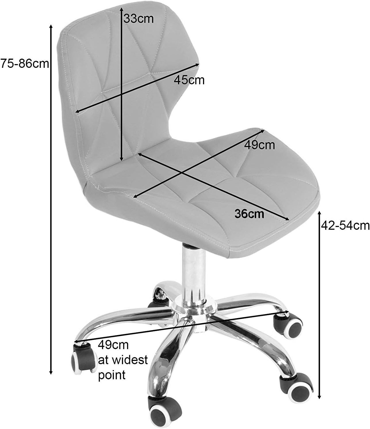الأبعاد: الارتفاع الكلي: 75-86 سم - عرض المقعد: 49 سم - عمق المقعد: 38 سم - ارتفاع المقعد: 42-54 سم - ارتفاع مسند الظهر: 33 سم - عرض مسند الظهر: 45 سم - عرض القاعدة: 49 سم.